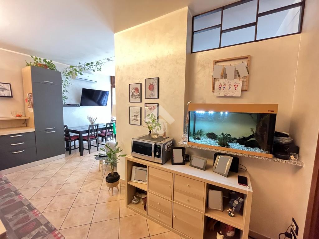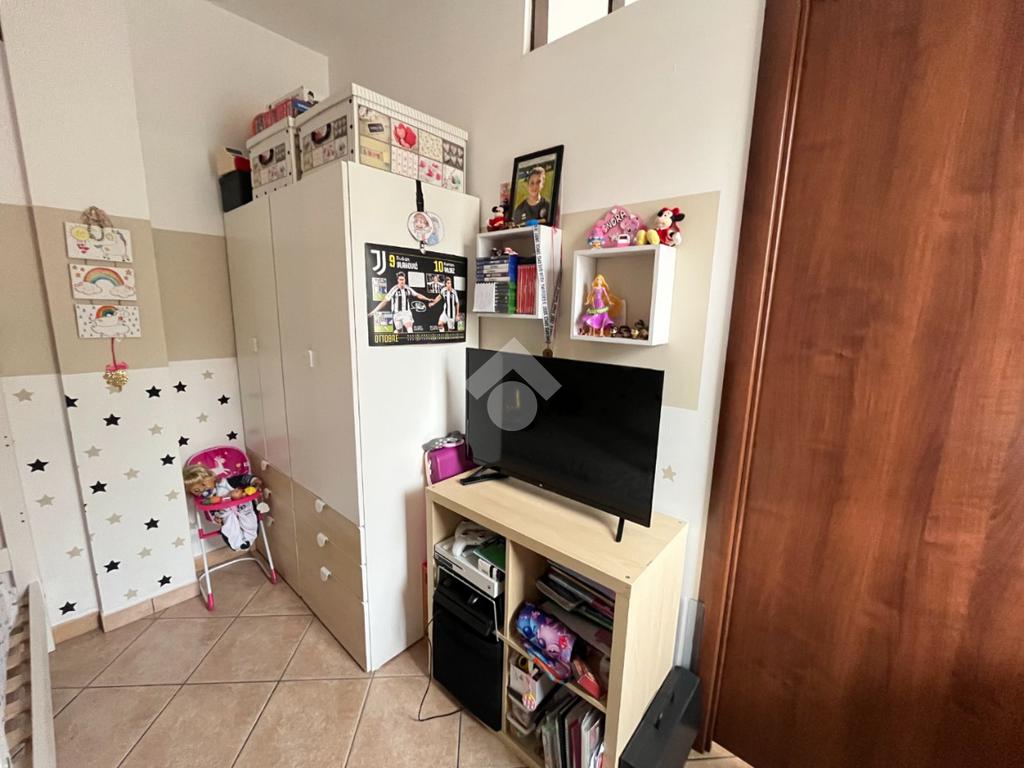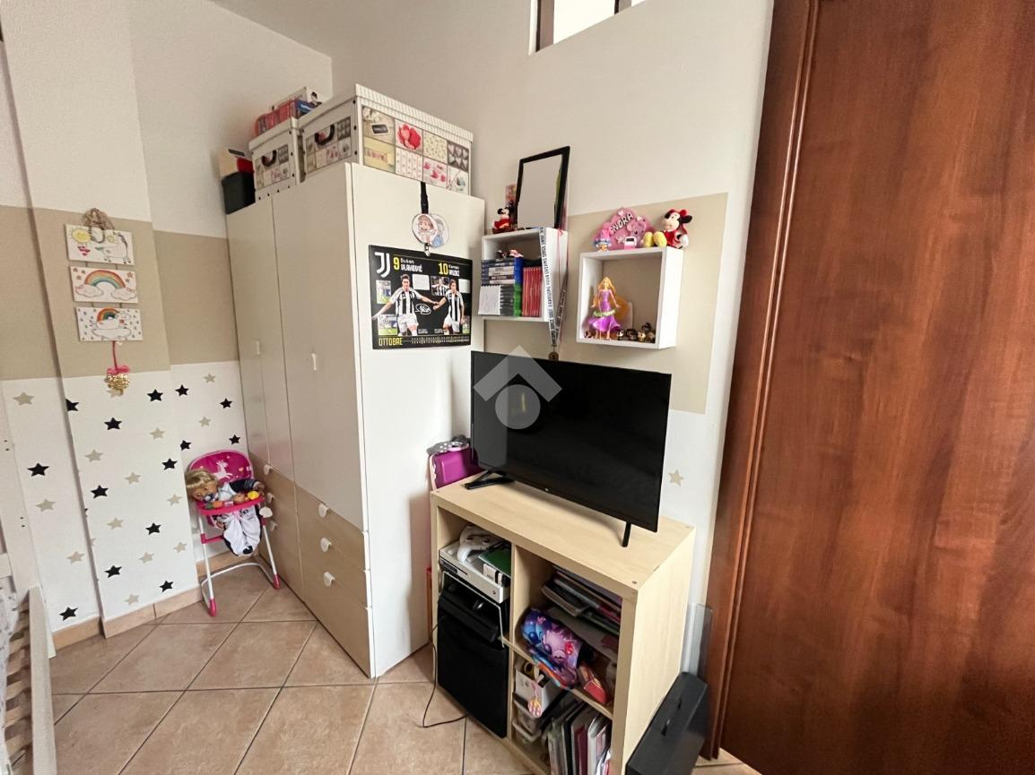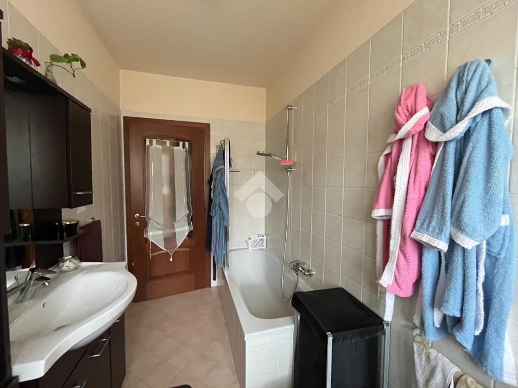 Il suo ingresso, tramite il portoncino blindato, è sulla zona giorno composta da soggiorno con cucina a vista. In questo ambiente, è stata ricavata una piccola stanza di 7 mq adibita a studio. Sempre al piano, il bagno con vasca, il ripostiglio e la camera da letto matrimoniale.