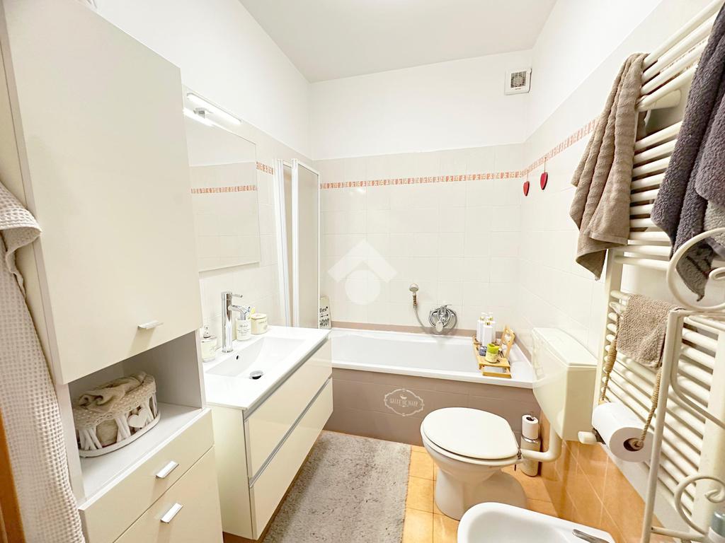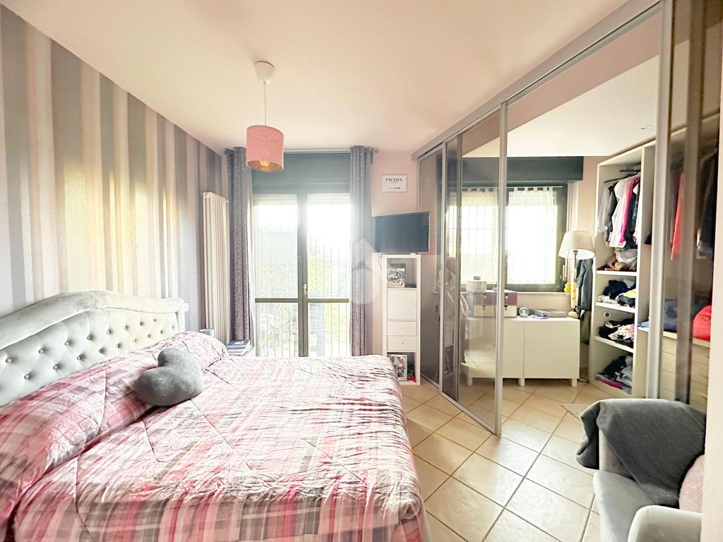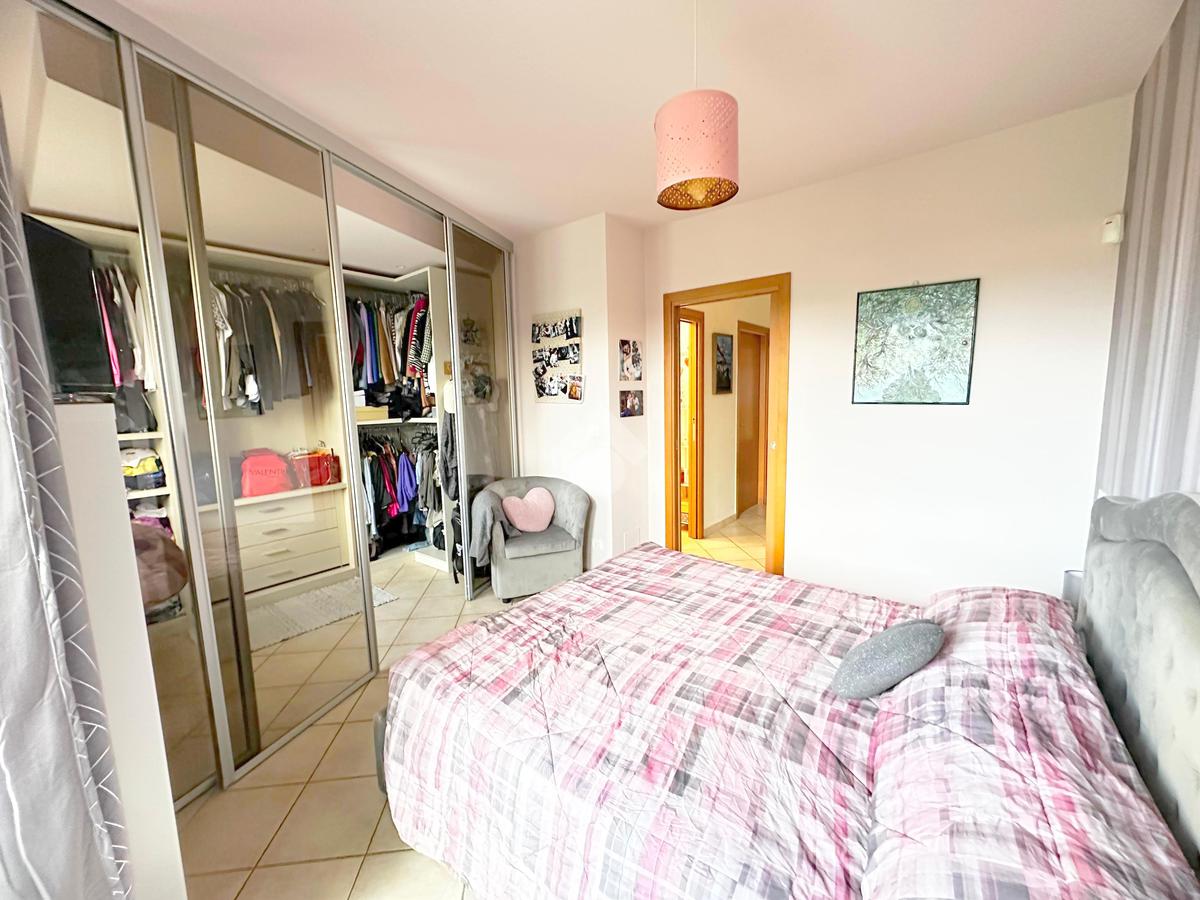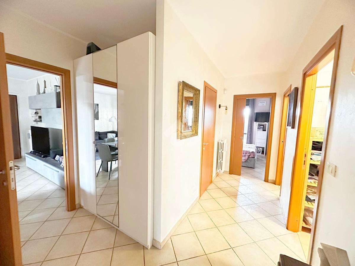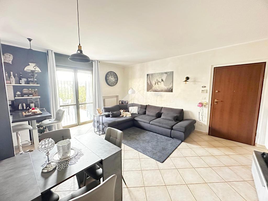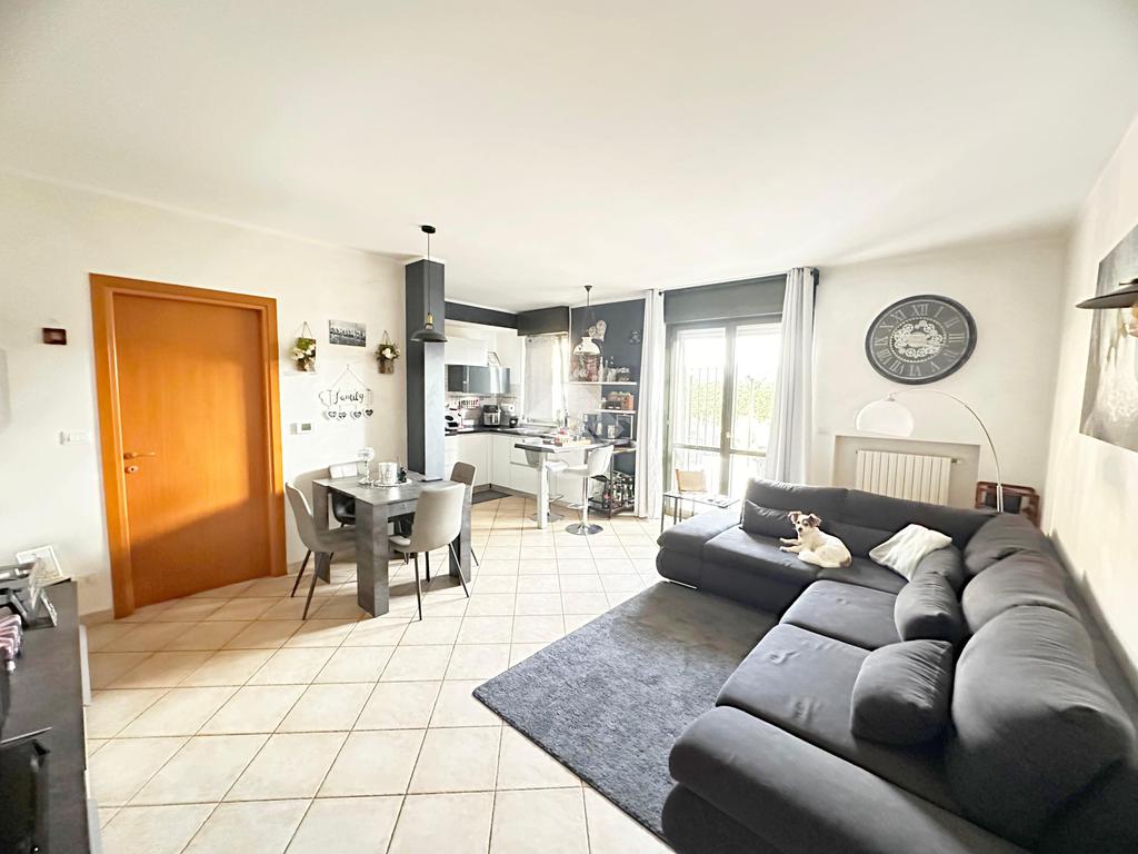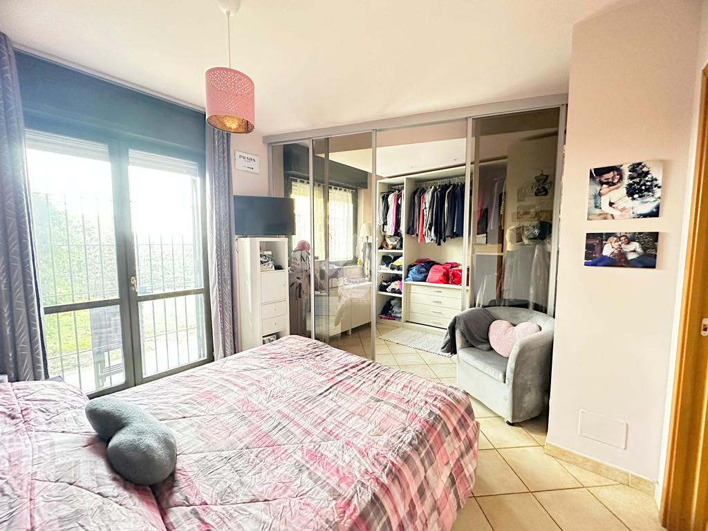 L’accesso all’immobile avviene sia dal vano scala sia da un accesso pedonale privato. L’appartamento è composto da ingresso living su soggiorno con cucina abitabile a vista, ampio disimpegno, due camere da letto matrimoniali, di cui una con cabina armadio, bagno con doccia, bagno con vasca e locale ripostiglio/lavanderia. Da tutti i vani vi è l'uscita diretta sul giardino privato di 160 mq. che circonda la proprietà il box auto e la cantina.