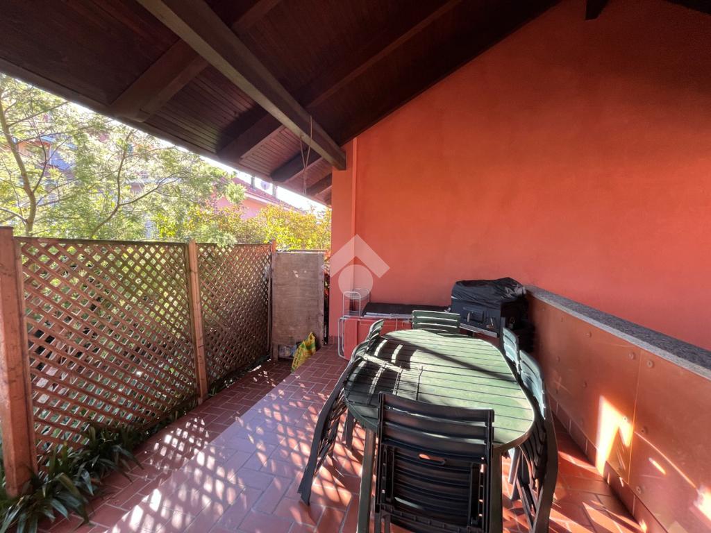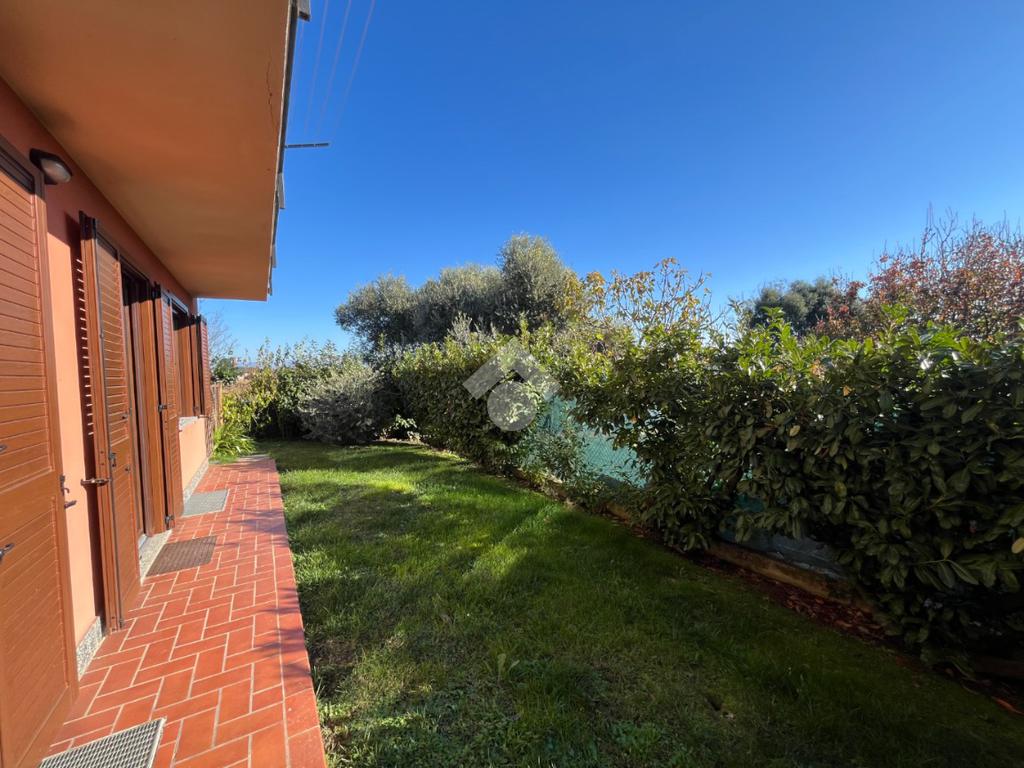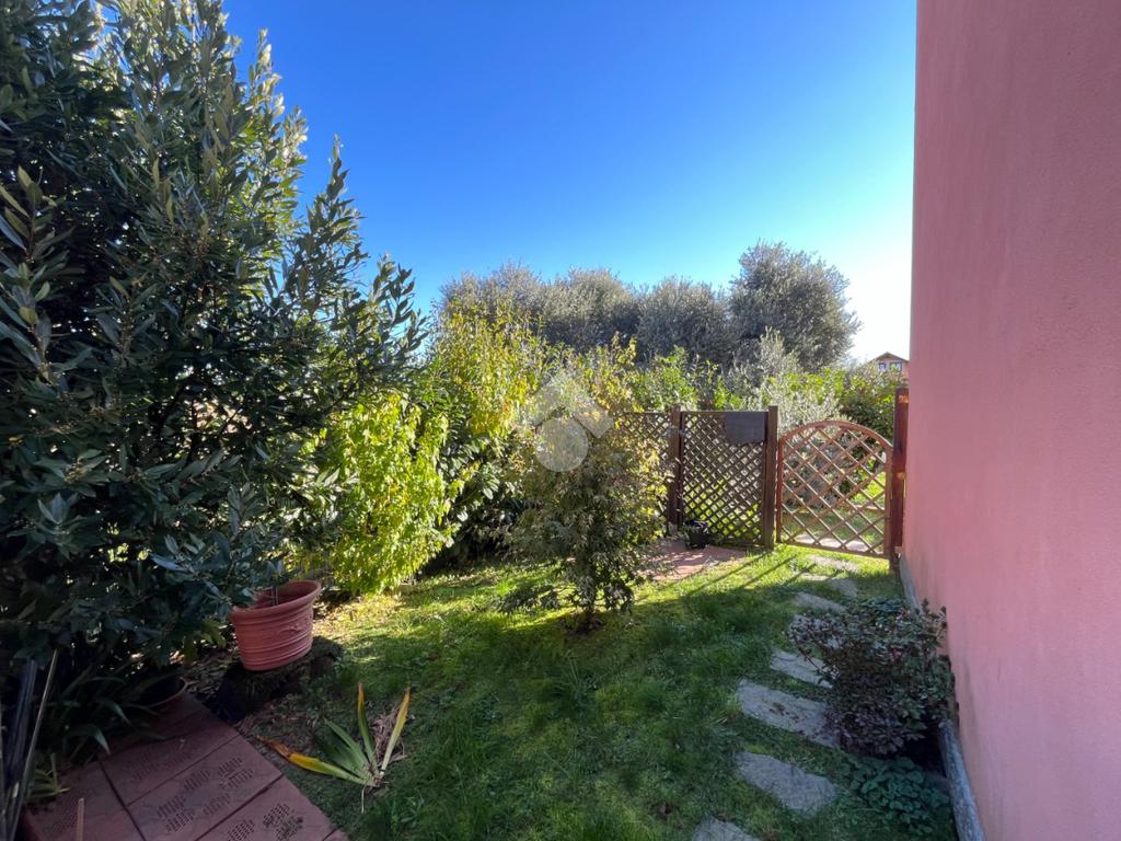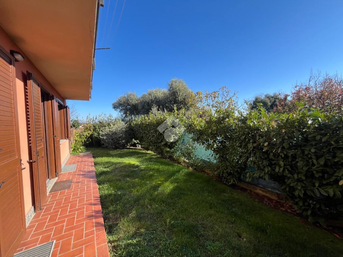 Il giardino circonda la proprietà ed è presente anche un comodo porticato coperto e piastrellato dotato di punto luce, ideale per essere utilizzato e vissuto nella bella stagione.