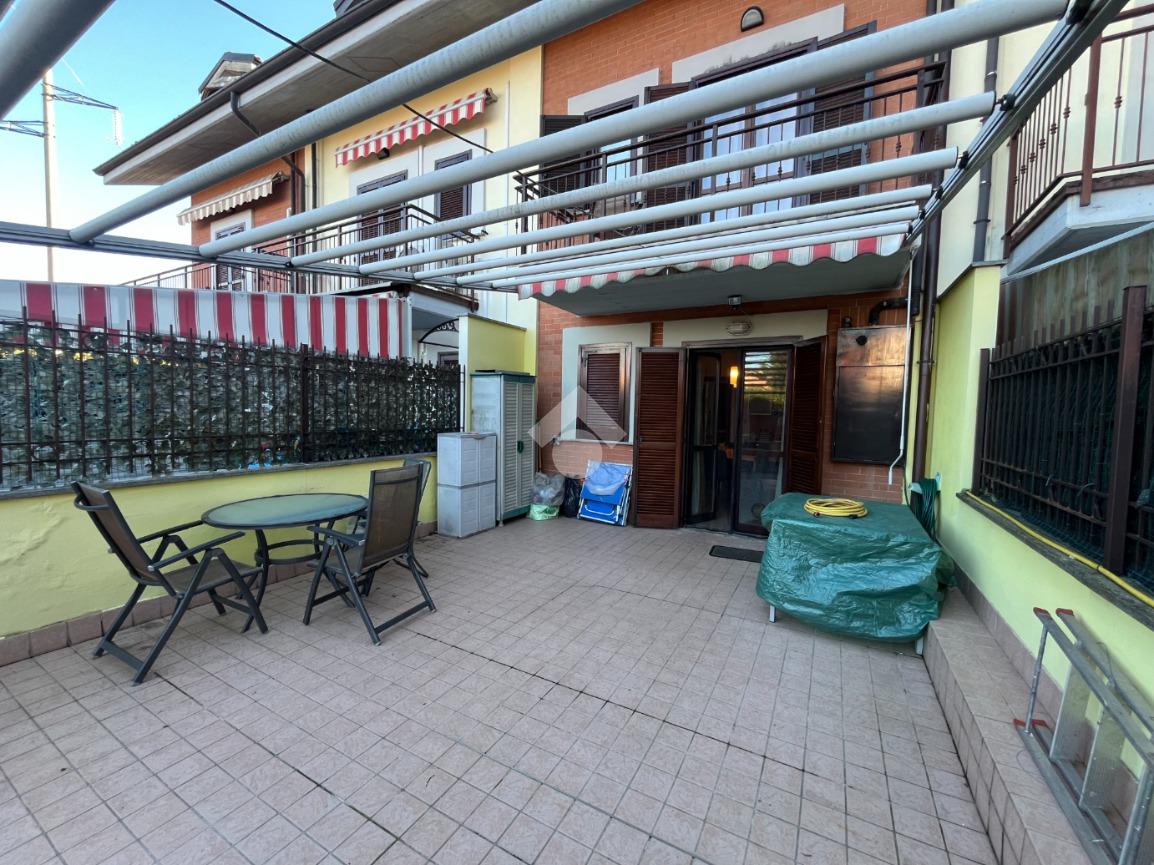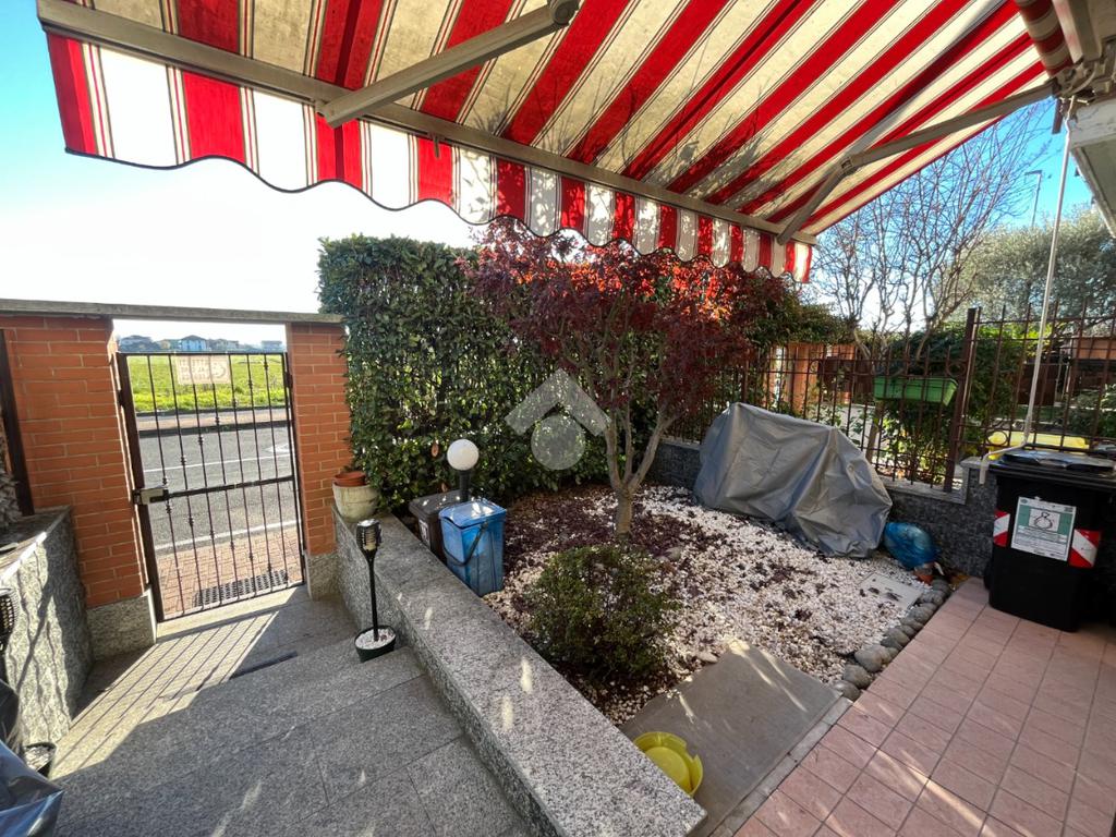 L'ingresso al piano terra, tramite il portoncino blindato, è sul soggiorno che conduce al bagno di servizio e alla cucina abitabile di generose dimensioni. La zona giorno si affaccia sul giardino posto sul retro, dotato di tende da sole, e sull'area esterna privata utilizzabile nella bella stagione.